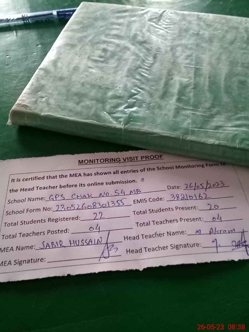 | EMIS Code: 38210162 | Name of School: GPS CHAK NO. 54 MB | |||