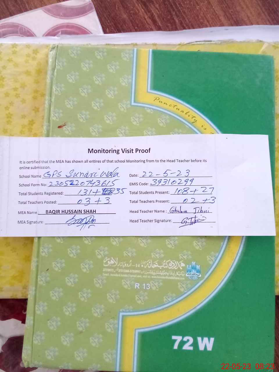| Attendance Register | Head Teacher | MEA with School | Visit Proof |