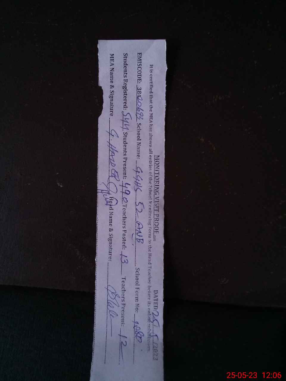 | Attendance Register | Head Teacher | MEA with School | Visit Proof |