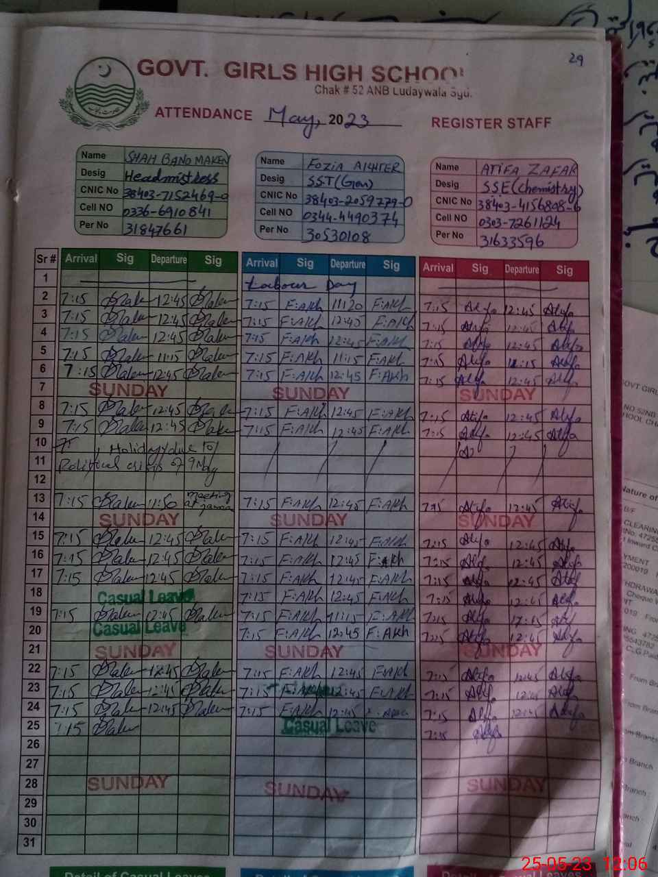 | CNIC | Full Name | Designation | R/C | Absence During Last Calender Month |