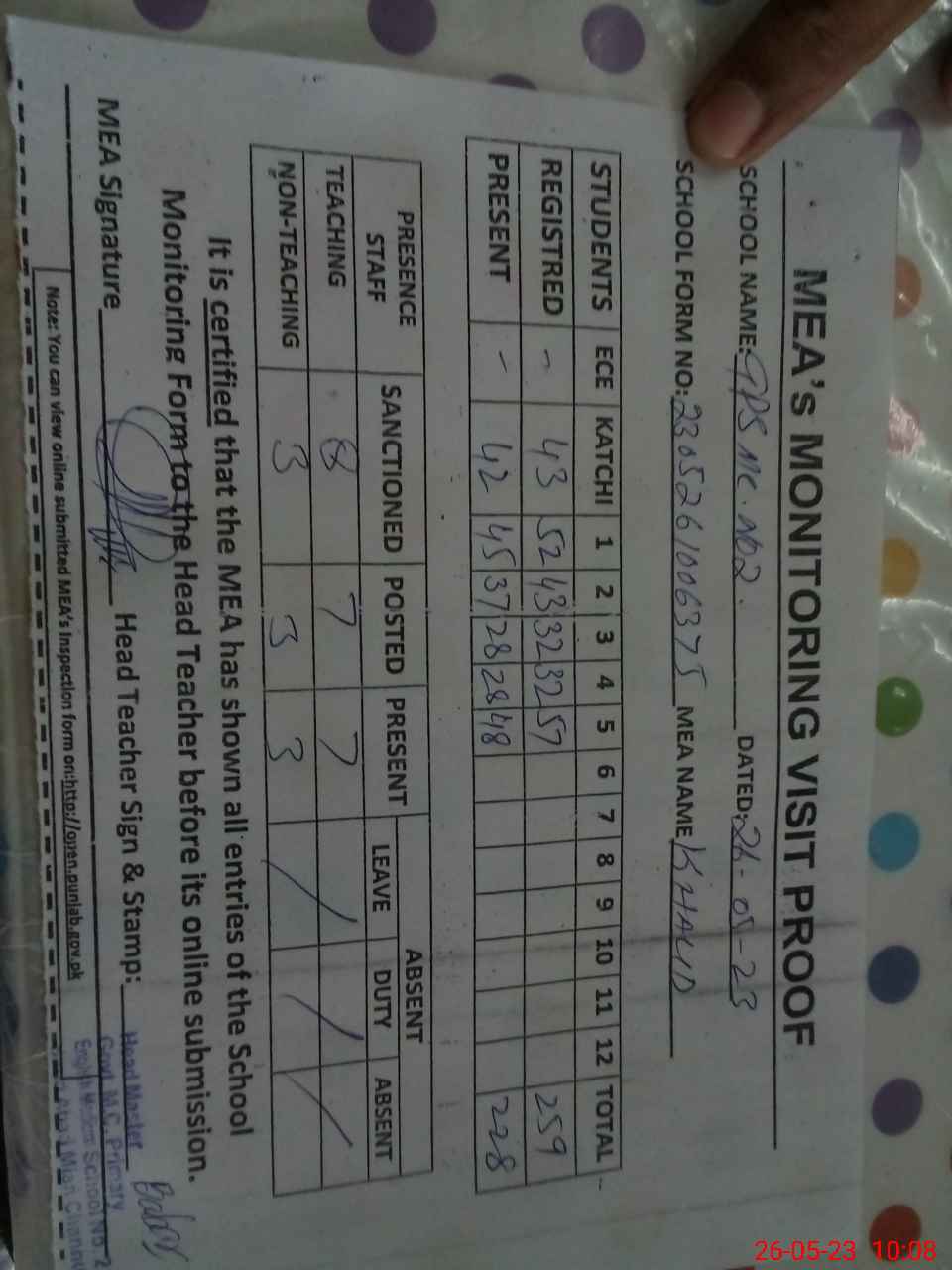 | Attendance Register | Head Teacher | MEA with School | Visit Proof |