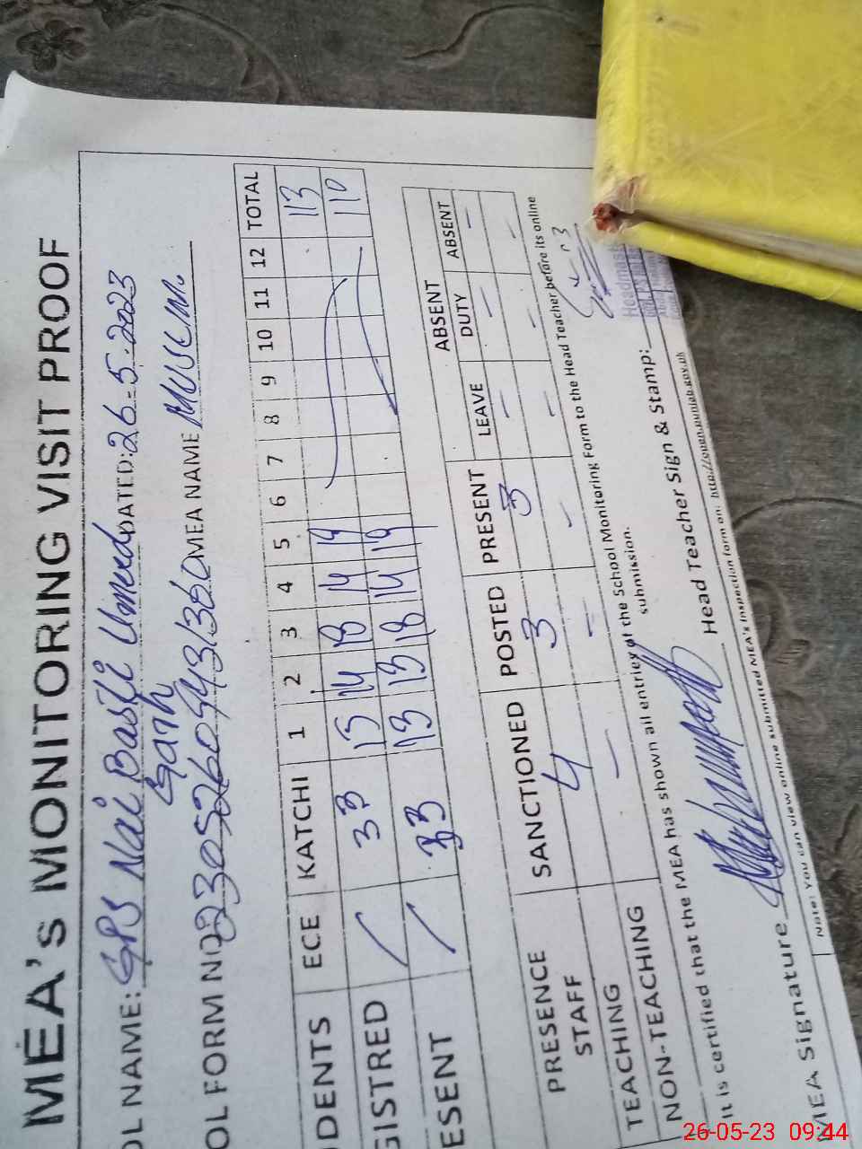 | Attendance Register | Head Teacher | MEA with School | Visit Proof |