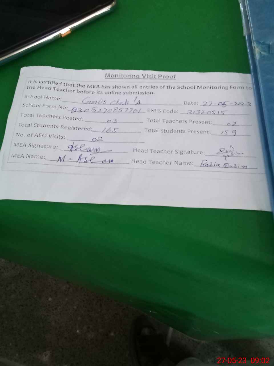 | Attendance Register | Head Teacher | MEA with School | Visit Proof |