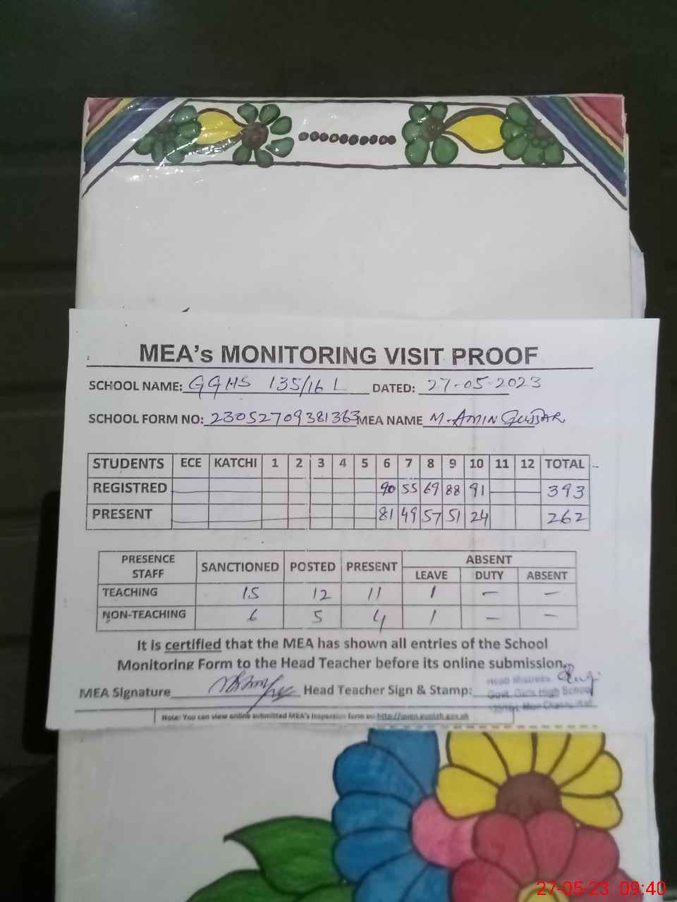 | Attendance Register | Head Teacher | MEA with School | Visit Proof |