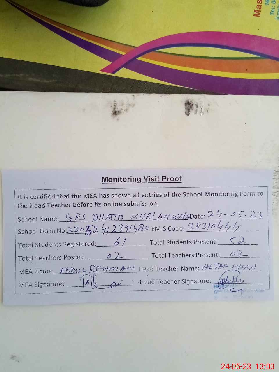 | Attendance Register | Head Teacher | MEA with School | Visit Proof |