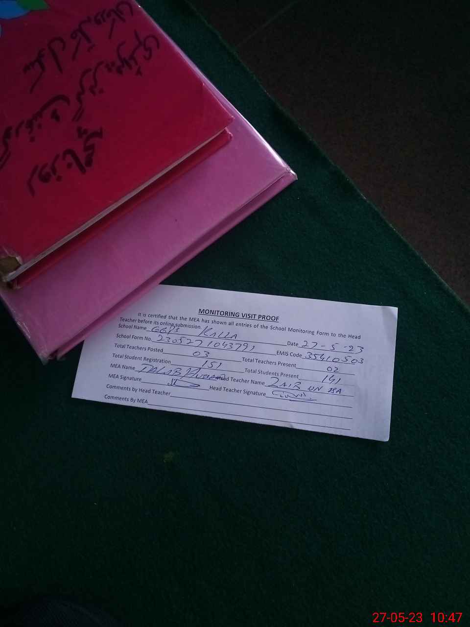 | Attendance Register | Head Teacher | MEA with School | Visit Proof |