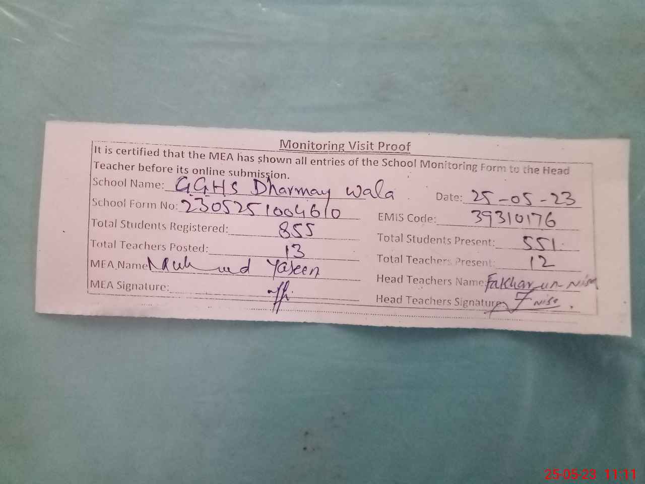 | Attendance Register | Head Teacher | MEA with School | Visit Proof |