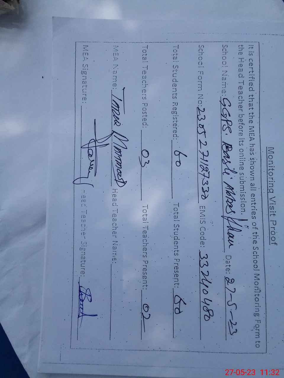 | Attendance Register | Head Teacher | MEA with School | Visit Proof |