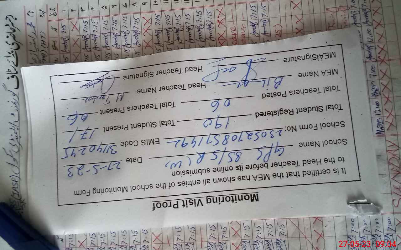 | Attendance Register | Head Teacher | MEA with School | Visit Proof |