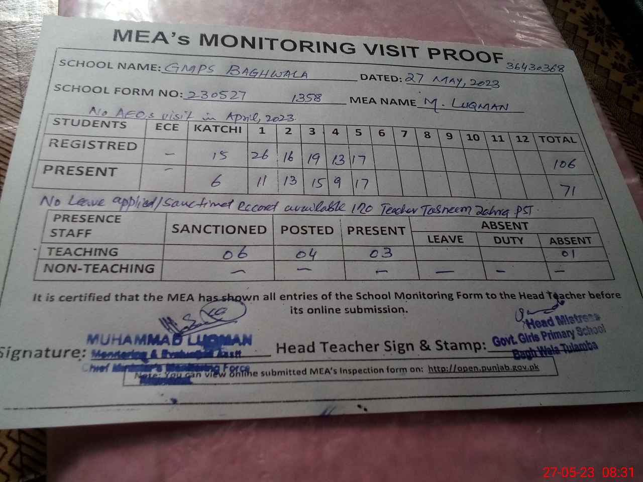 | Attendance Register | Head Teacher | MEA with School | Visit Proof |