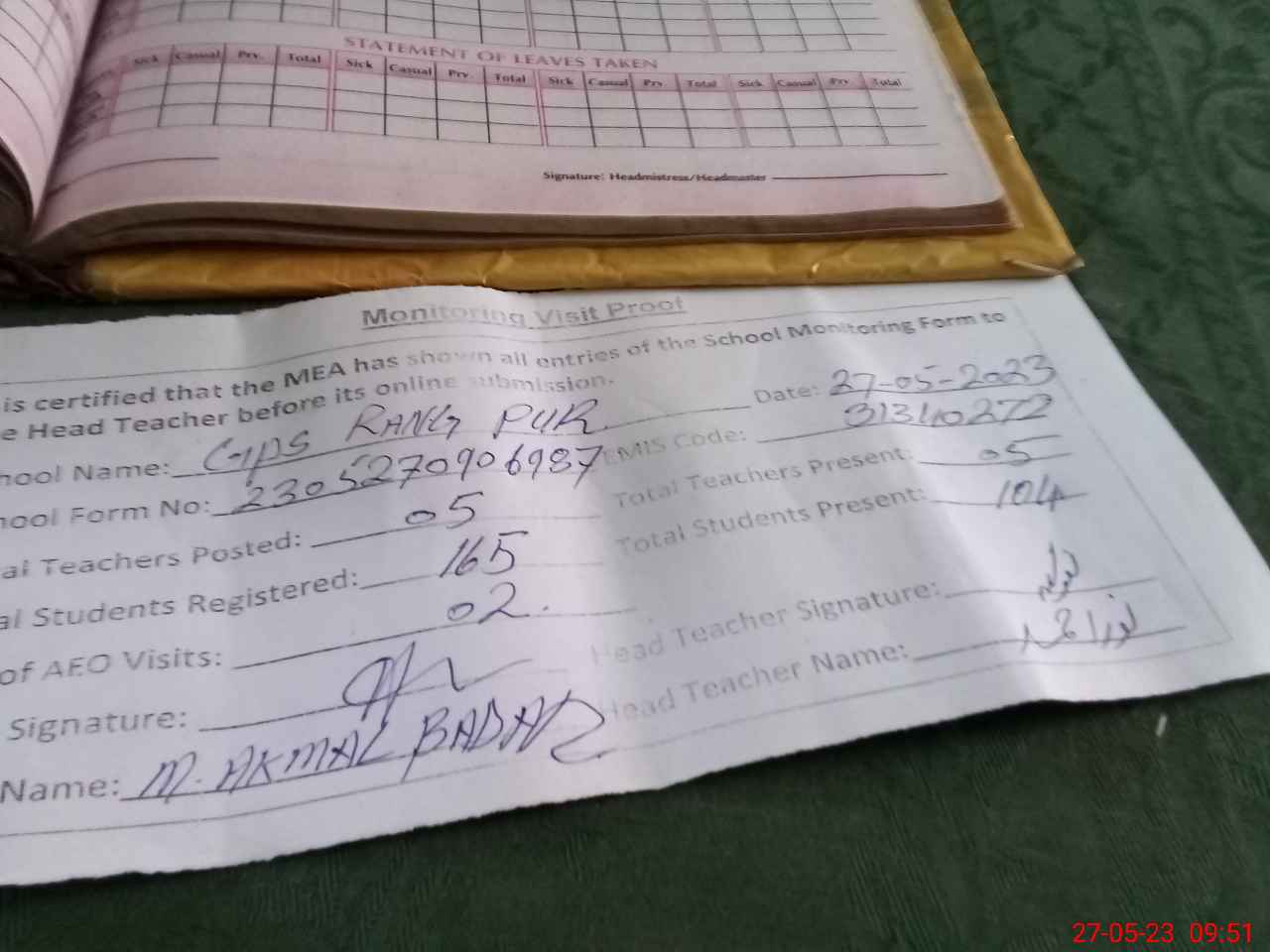 | EMIS Code: 31340272 | Name of School: GPS RANG PUR | |||