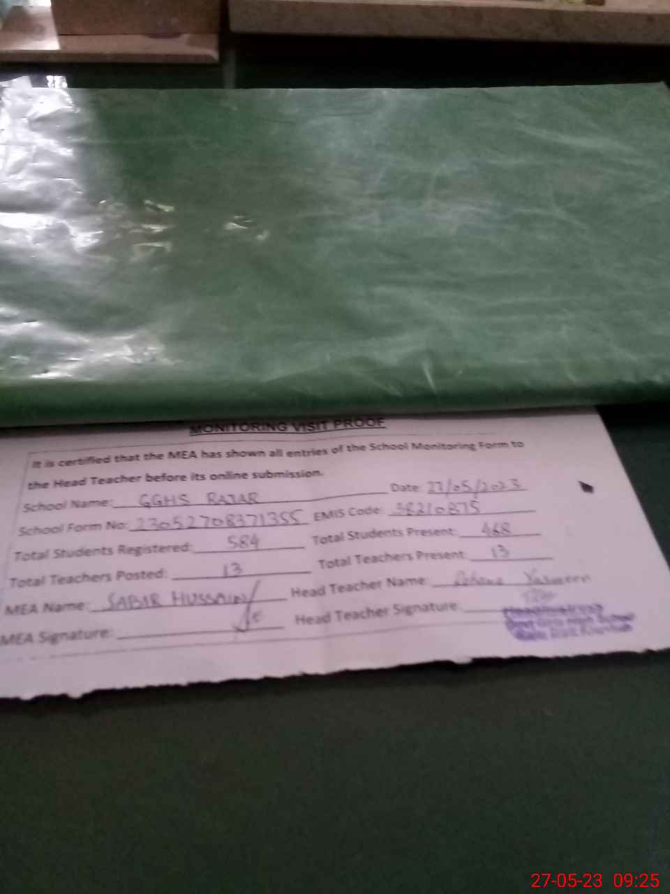 | Attendance Register | Head Teacher | MEA with School | Visit Proof |