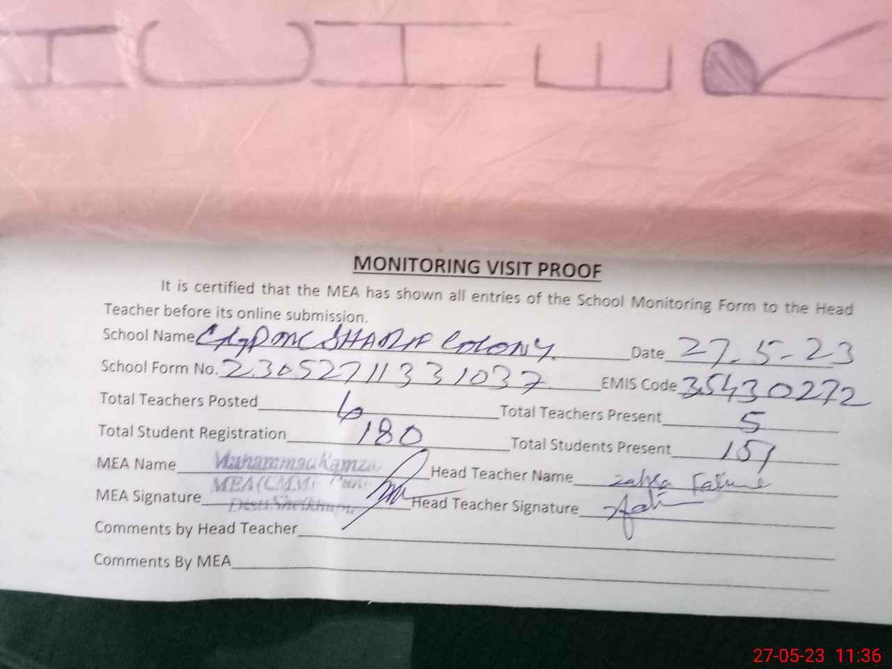 | Attendance Register | Head Teacher | MEA with School | Visit Proof |