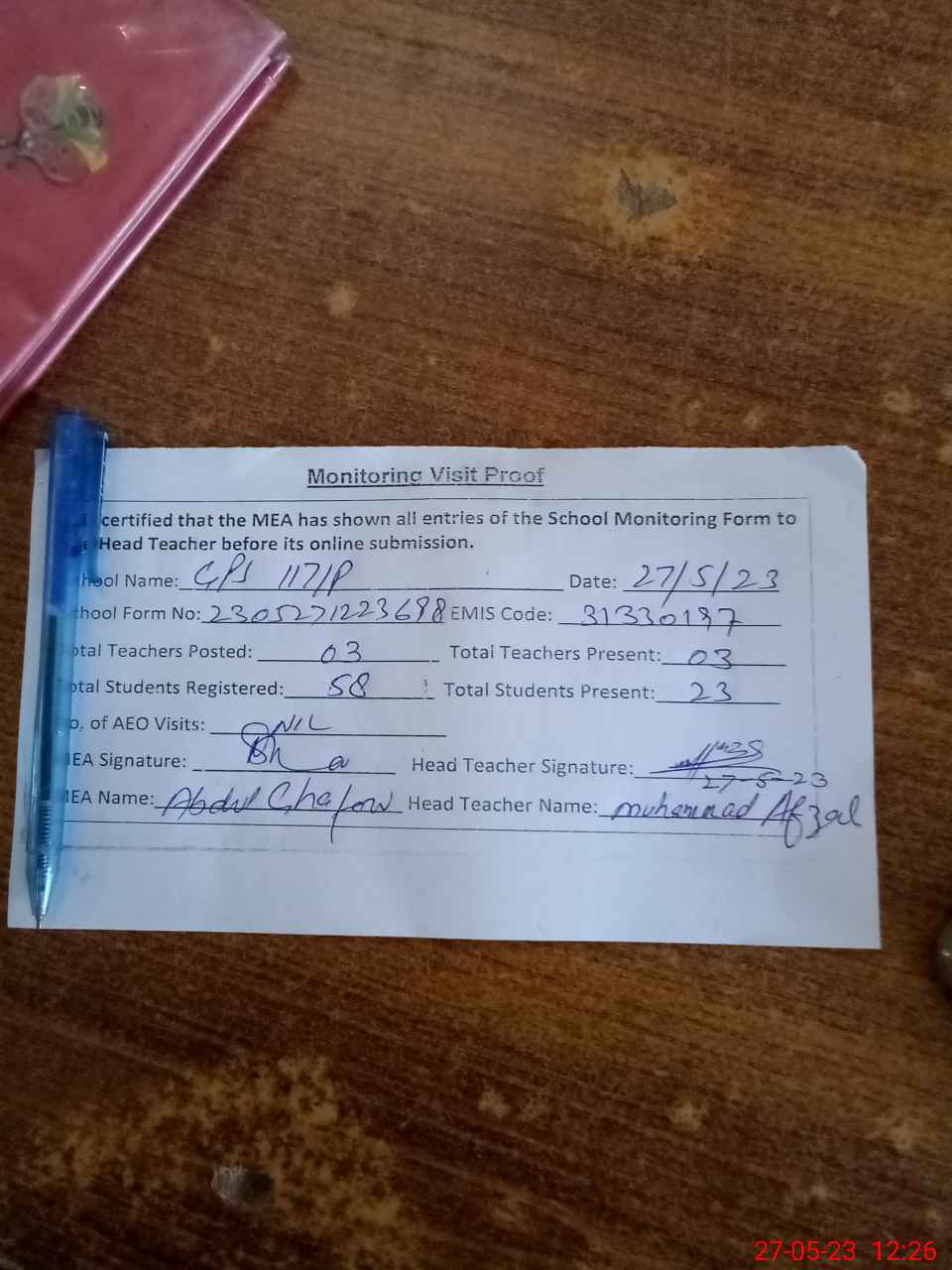 | Attendance Register | Head Teacher | MEA with School | Visit Proof |