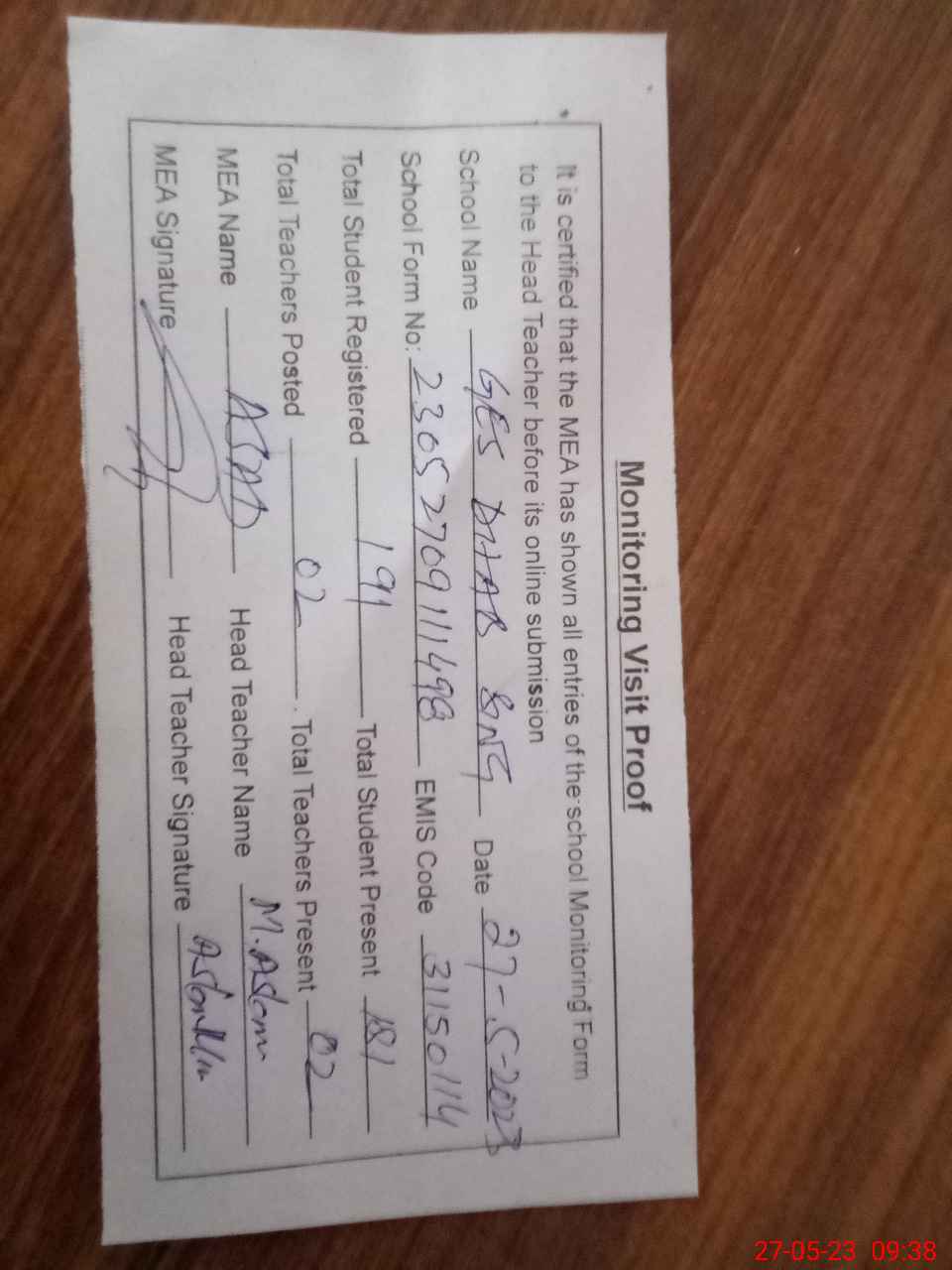 | Attendance Register | Head Teacher | MEA with School | Visit Proof |