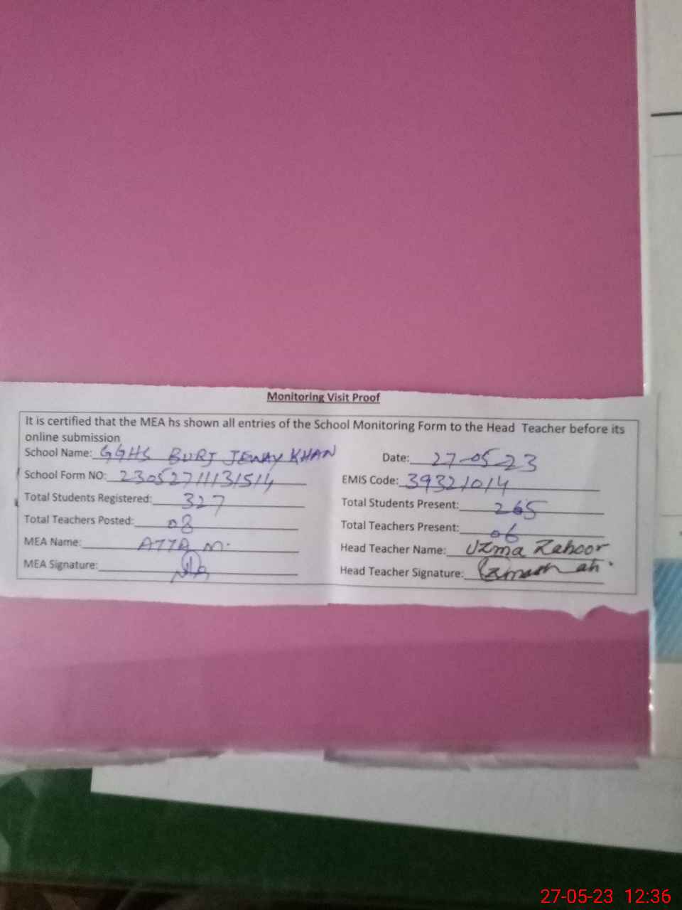 | Attendance Register | Head Teacher | MEA with School | Visit Proof |