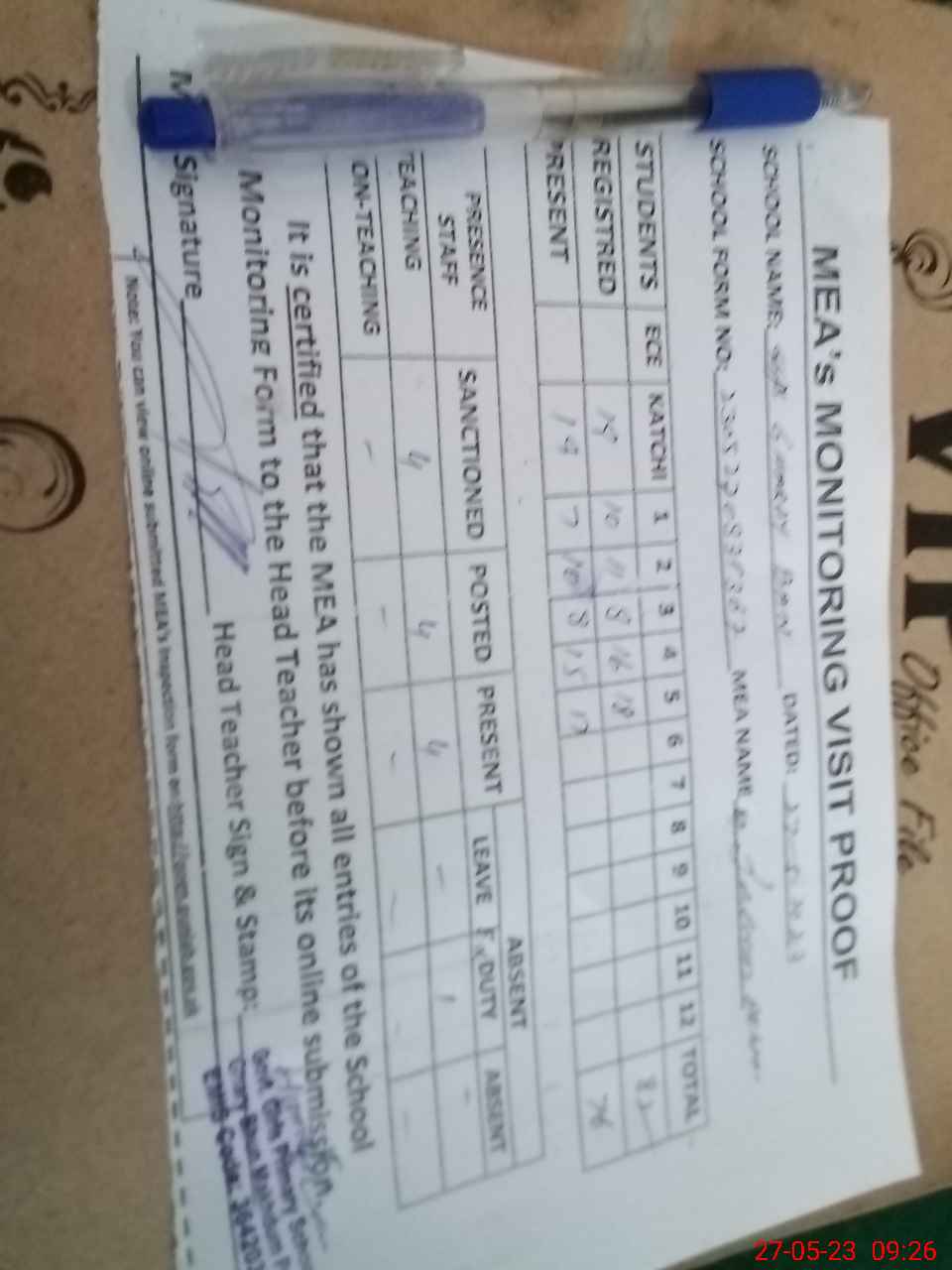 | Attendance Register | Head Teacher | MEA with School | Visit Proof |