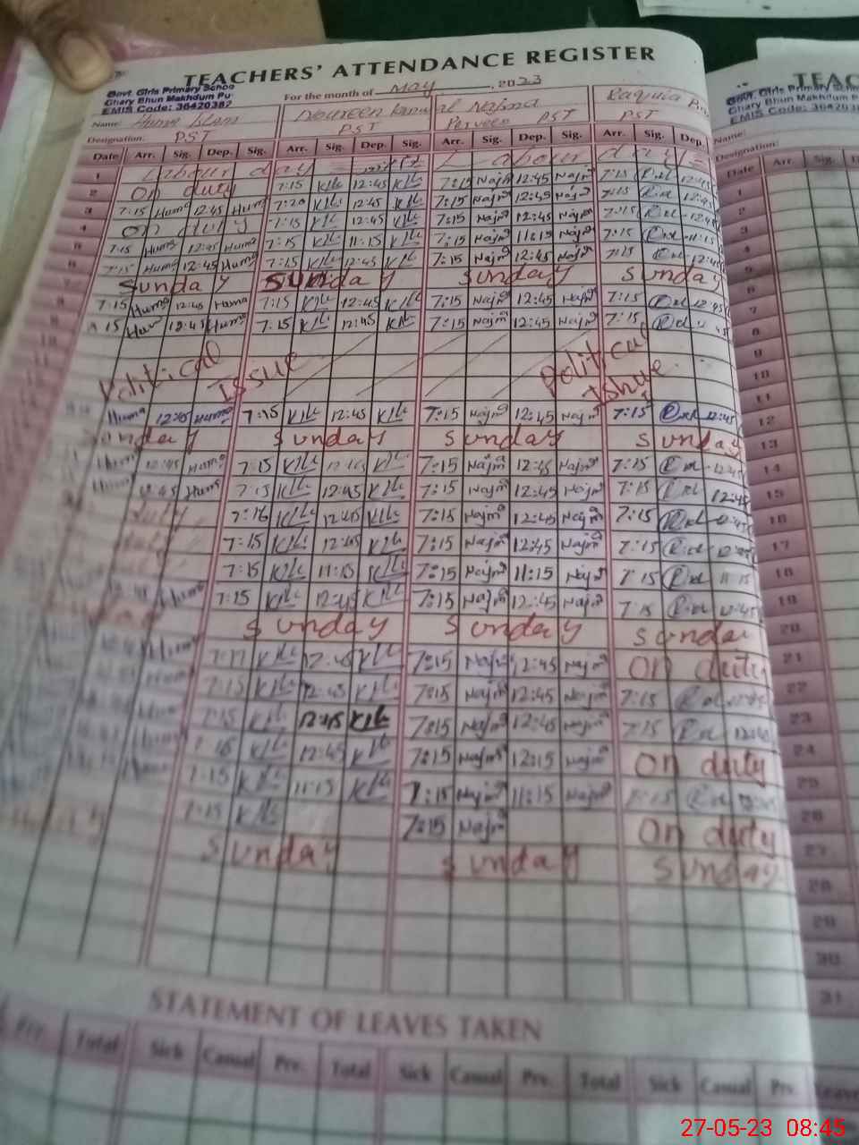 | 36**** | Ra**** Ba**** | PST | Regular | 0 | 0 | 0 | 0 | 0 | 0 | 0 | 0 | 0 | Exam Duty |