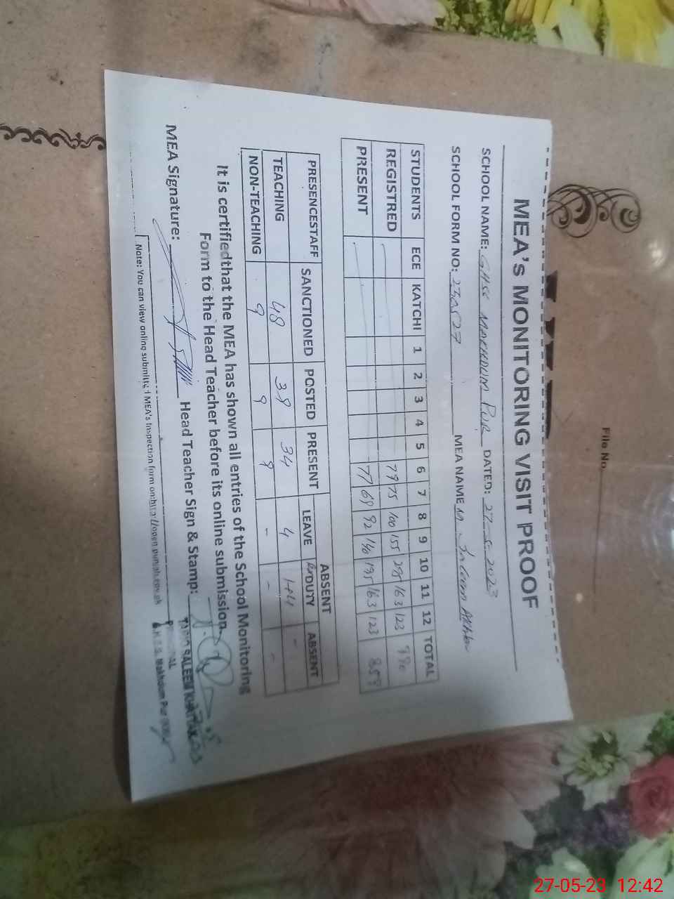 | Certified that this School was Inspected by the Undersigned MEA/DMO Today and the Information Stated Above is as Per Record. | |||||