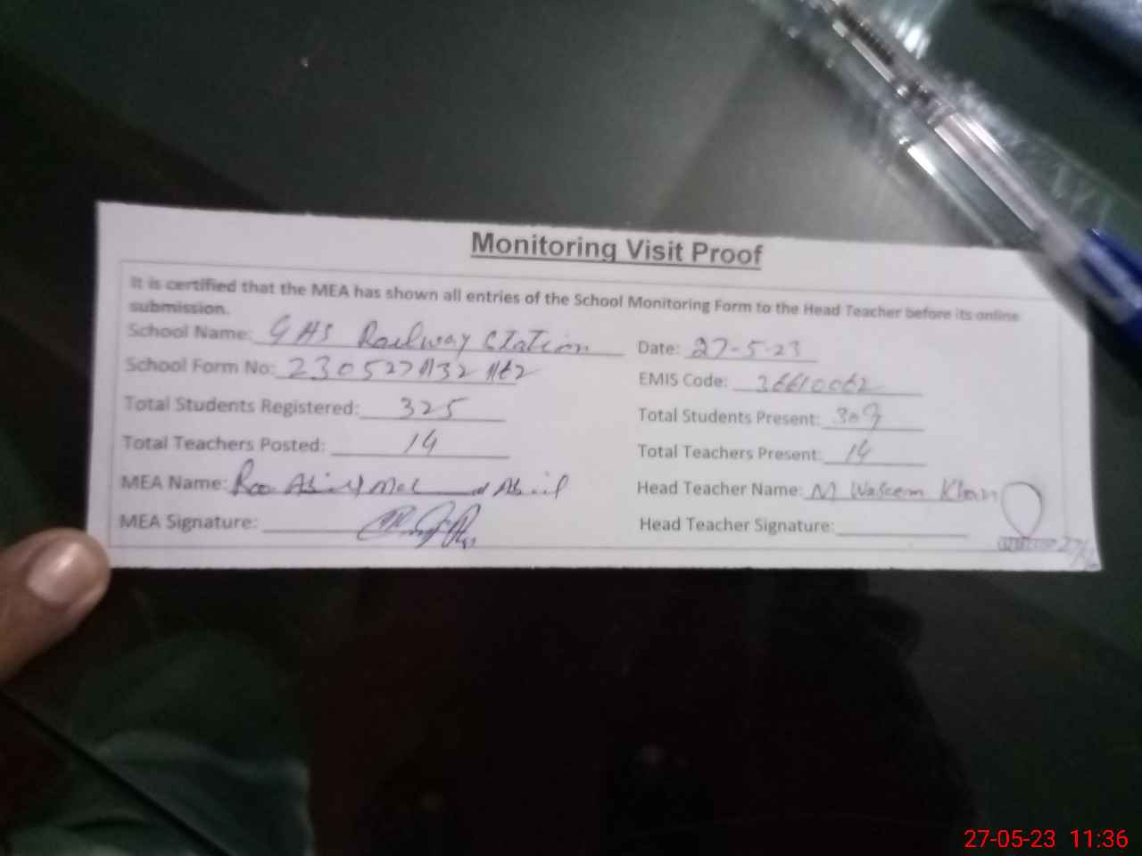 | Attendance Register | Head Teacher | MEA with School | Visit Proof |