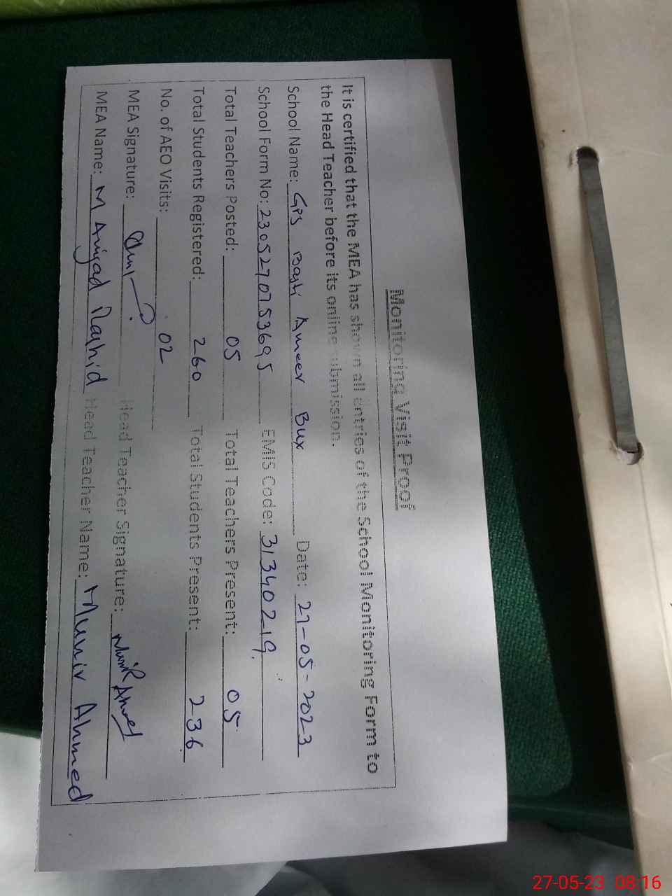 | Attendance Register | Head Teacher | MEA with School | Visit Proof |