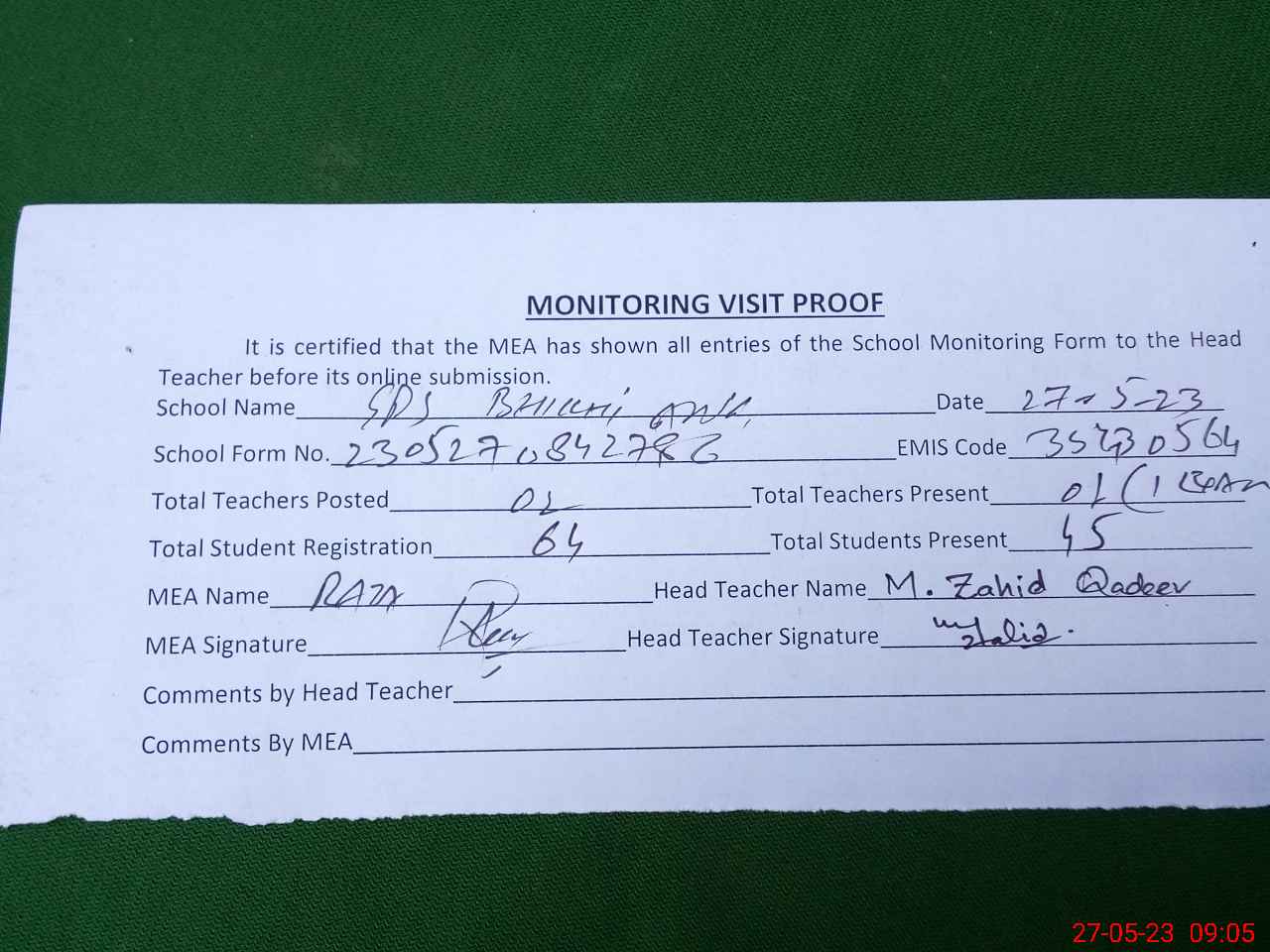 | Attendance Register | Head Teacher | MEA with School | Visit Proof |