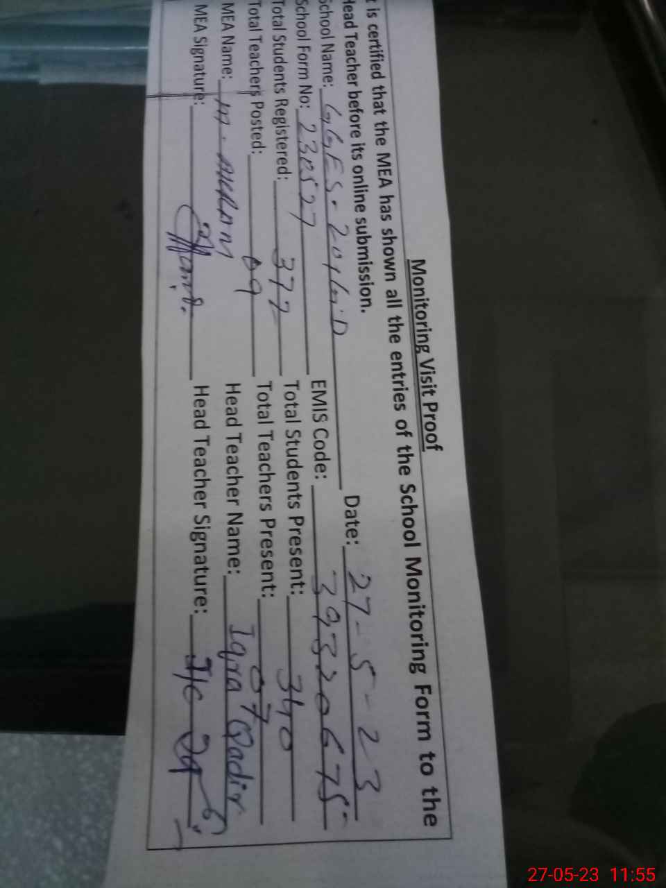 | Attendance Register | Head Teacher | MEA with School | Visit Proof |