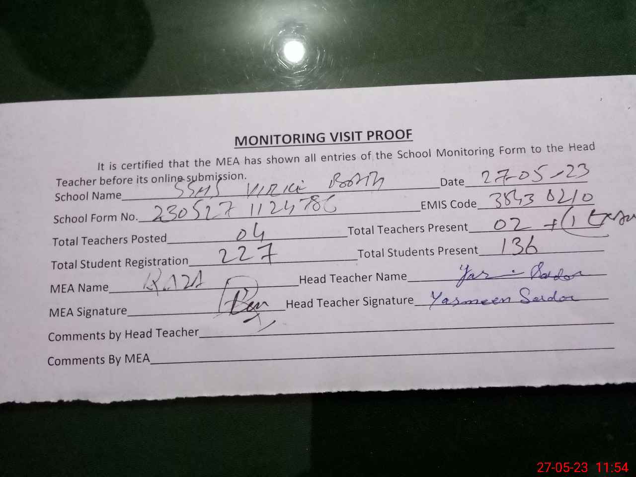 | Attendance Register | Head Teacher | MEA with School | Visit Proof |