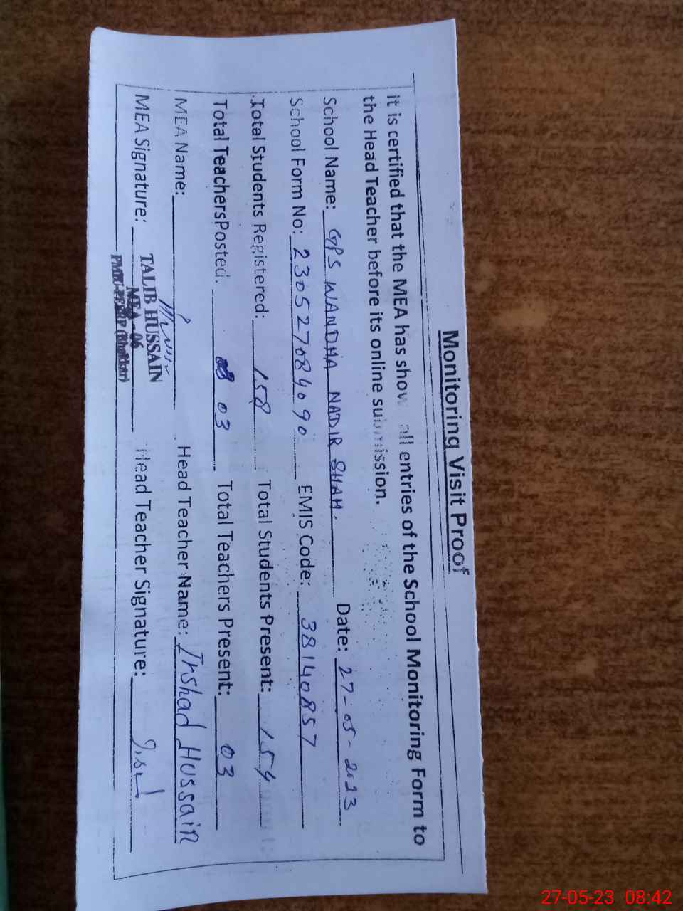 | Attendance Register | Head Teacher | MEA with School | Visit Proof |