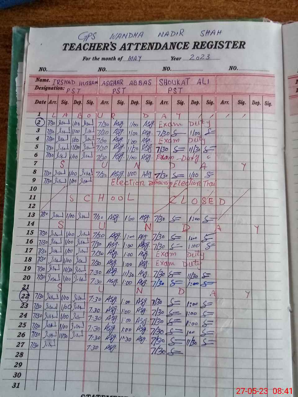 | Monitoring Date: 27-05-2023 | Start Time: 27-05-2023 08:02 AM | End Time: 27-05-2023 08:44 AM | Name of MEA: Ta**** Hu**** | |