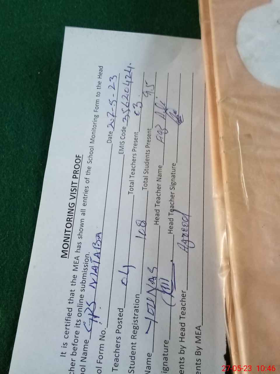 | Attendance Register | Head Teacher | MEA with School | Visit Proof |
