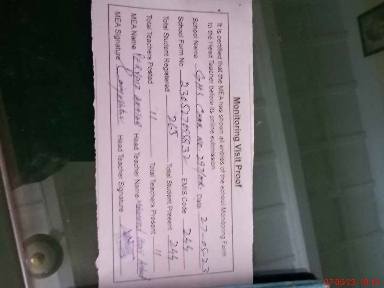 | Attendance Register | Head Teacher | MEA with School | Visit Proof |