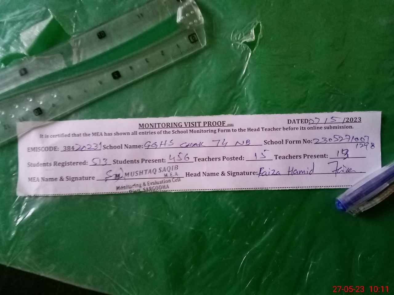 | Attendance Register | Head Teacher | MEA with School | Visit Proof |