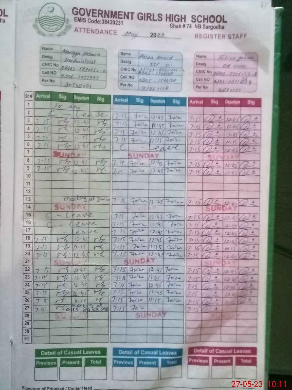 | CNIC | Full Name | Designation | R/C | Absence during last cal. month |