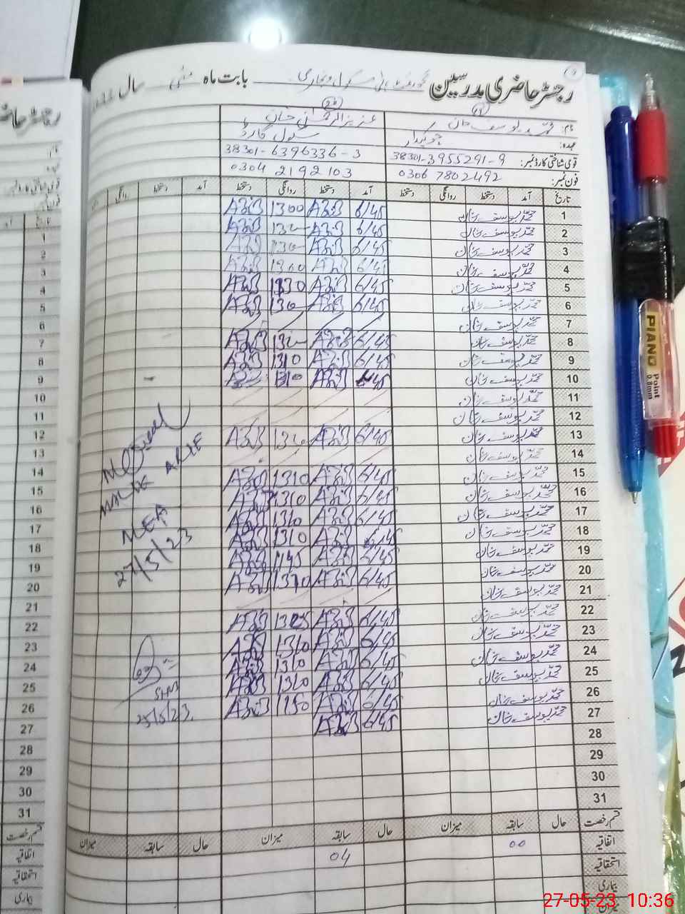 | Total no. of Classrooms: 15 No. of Classrooms Used for Teaching: 15 No. of Classrooms Storing Old Furniture, FTBs, etc: 0Comments if Any: D 3 form available however sets of books issued to the students not completed yet Teacher Mr Muhammad Rafiq marked as absent as no approved leave shown |