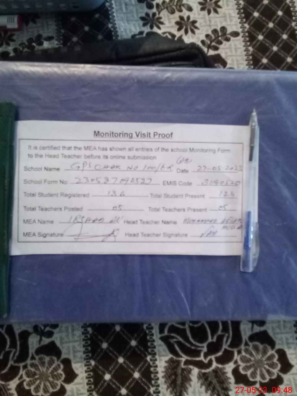 | Attendance Register | Head Teacher | MEA with School | Visit Proof |