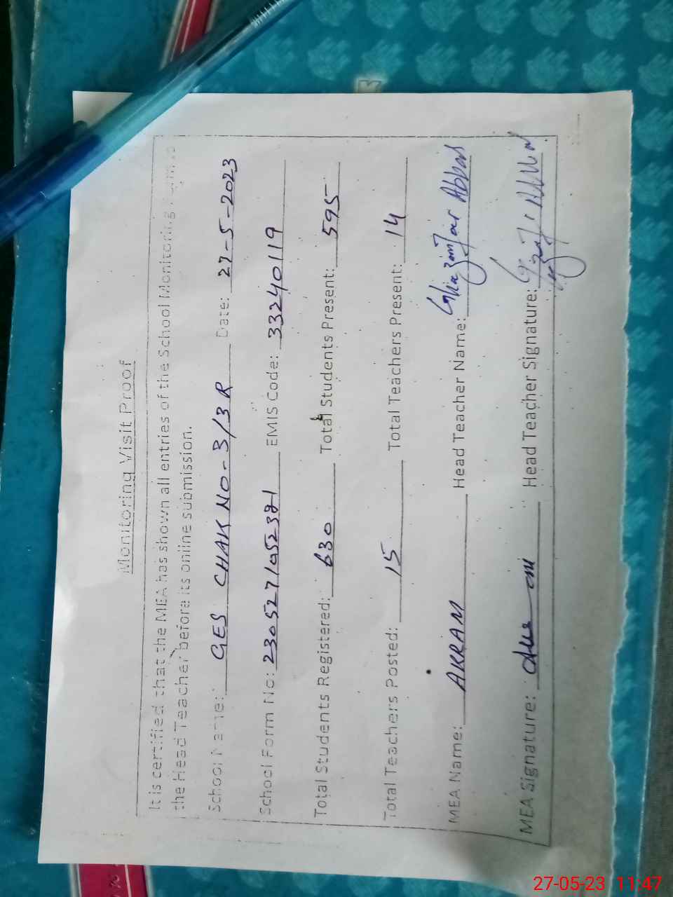 | Attendance Register | Head Teacher | MEA with School | Visit Proof |