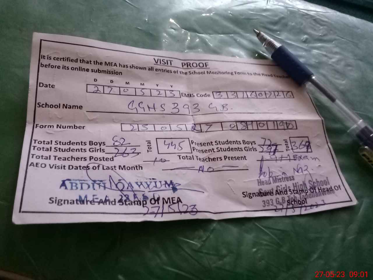 | Attendance Register | Head Teacher | MEA with School | Visit Proof |