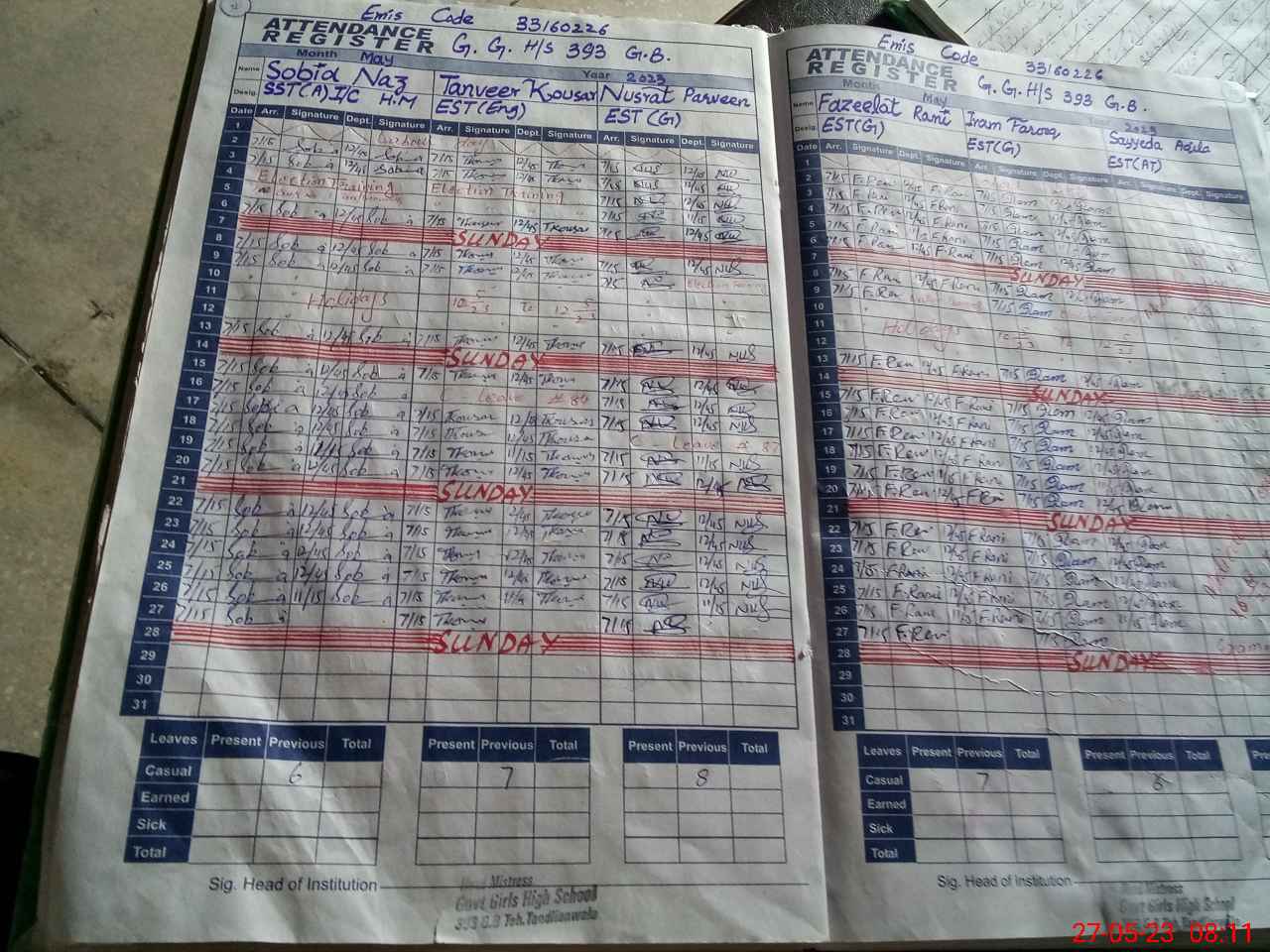| 33**** | Sa**** Aq**** | Regular | 2 | 17 | 0 | 0 | 0 | 0 | 0 | 0 | 2 | Exam Duty | |