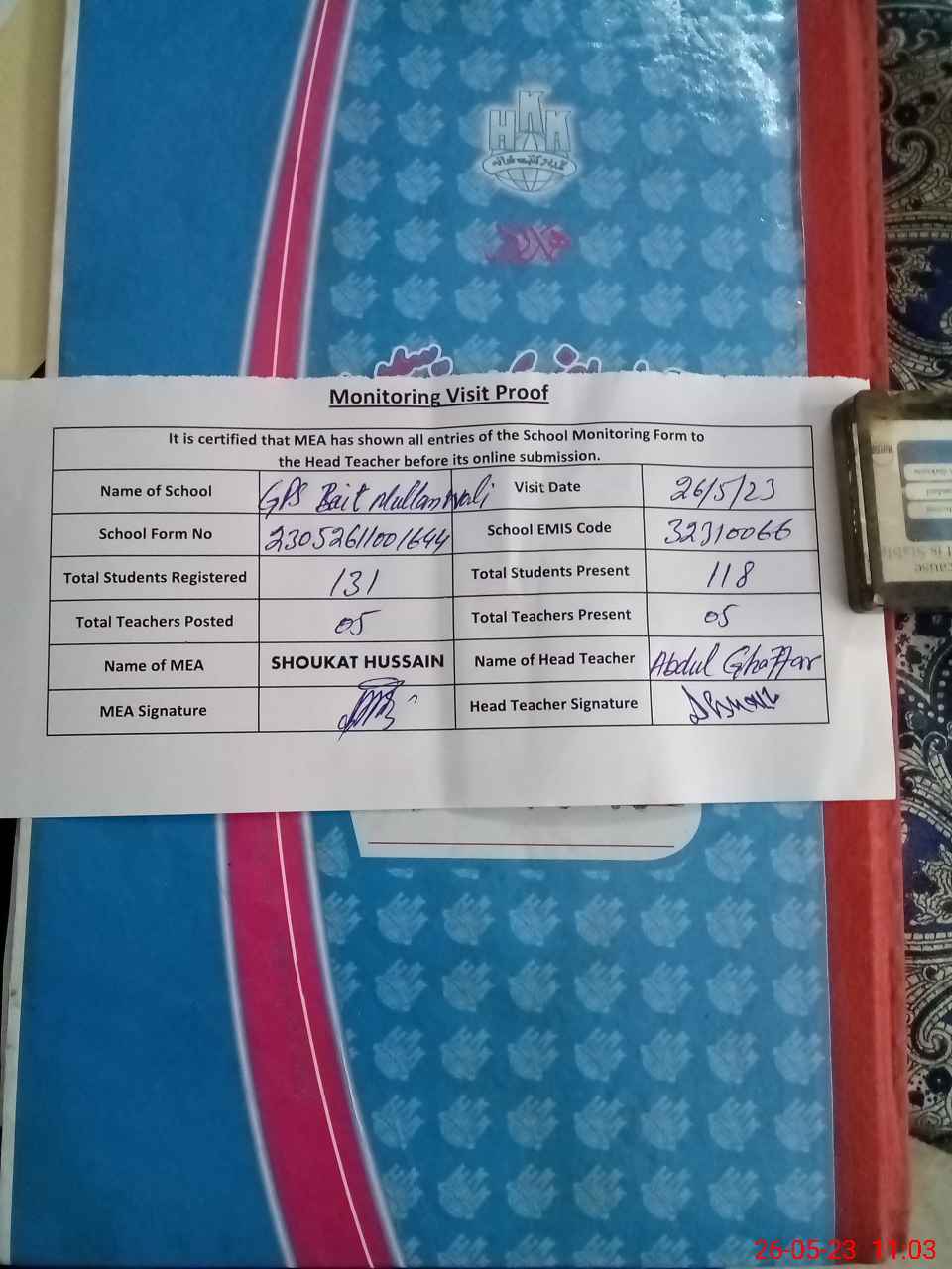 | Attendance Register | Head Teacher | MEA with School | Visit Proof |