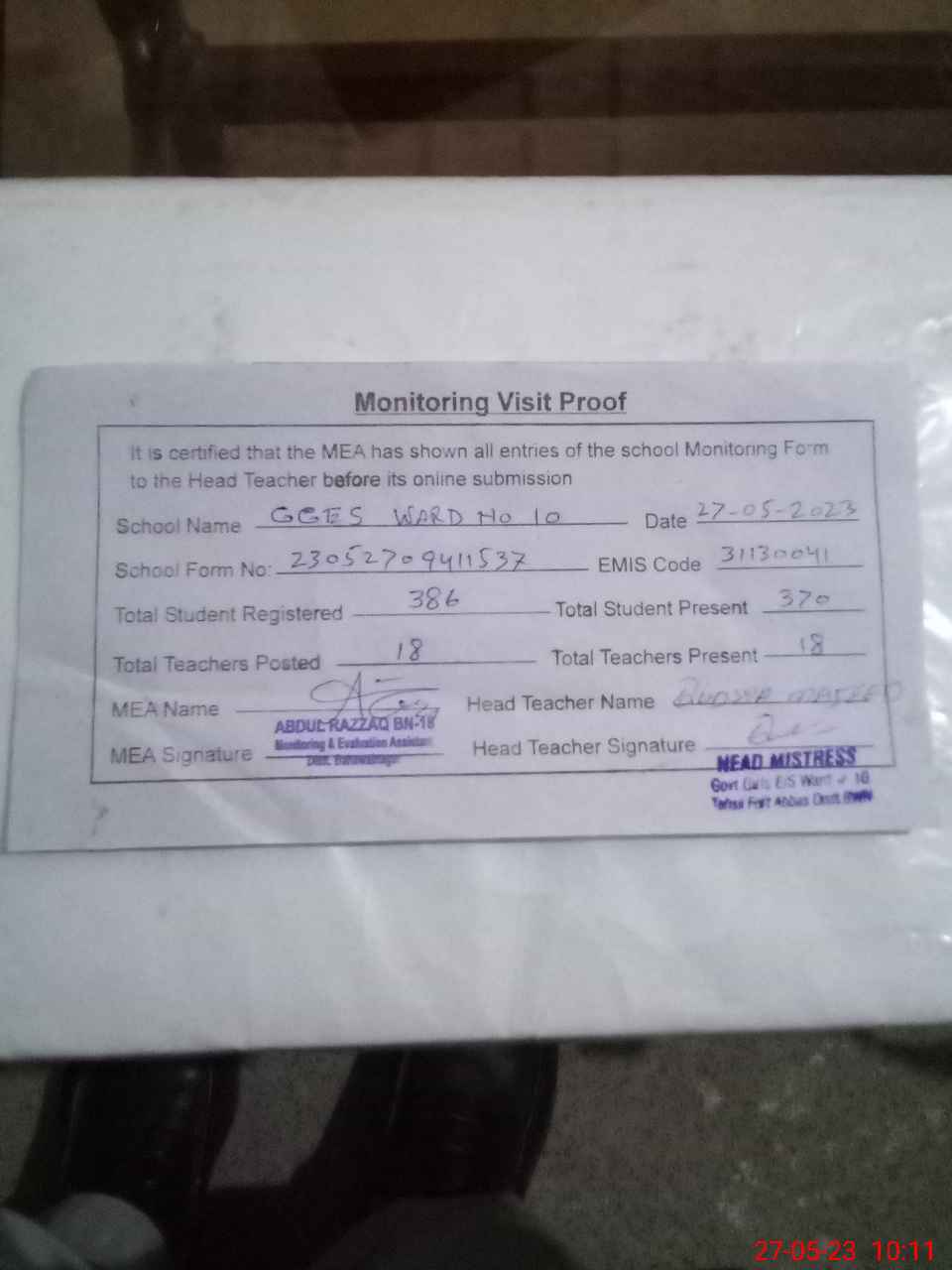 | Attendance Register | Head Teacher | MEA with School | Visit Proof |