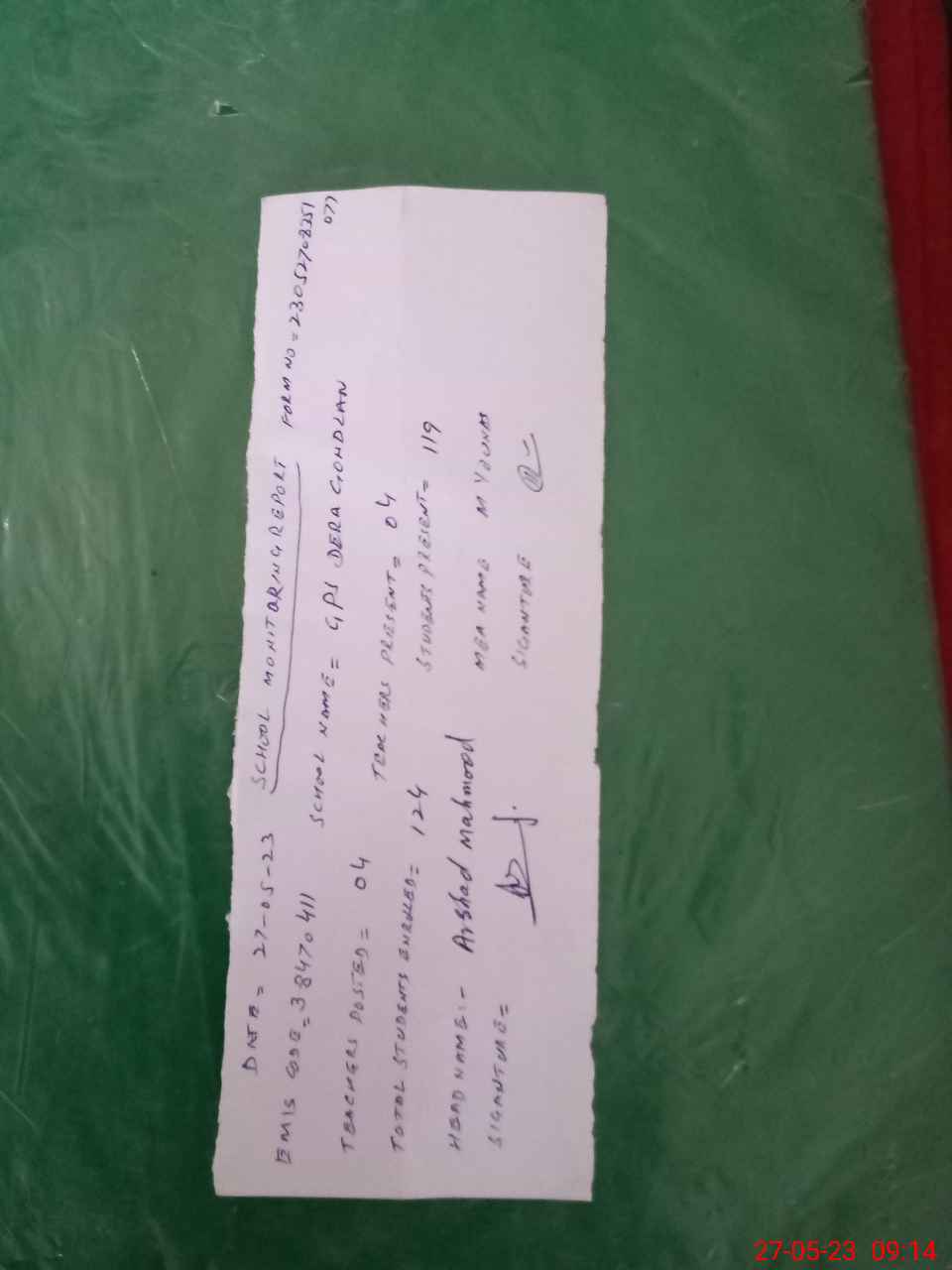 | Attendance Register | Head Teacher | MEA with School | Visit Proof |