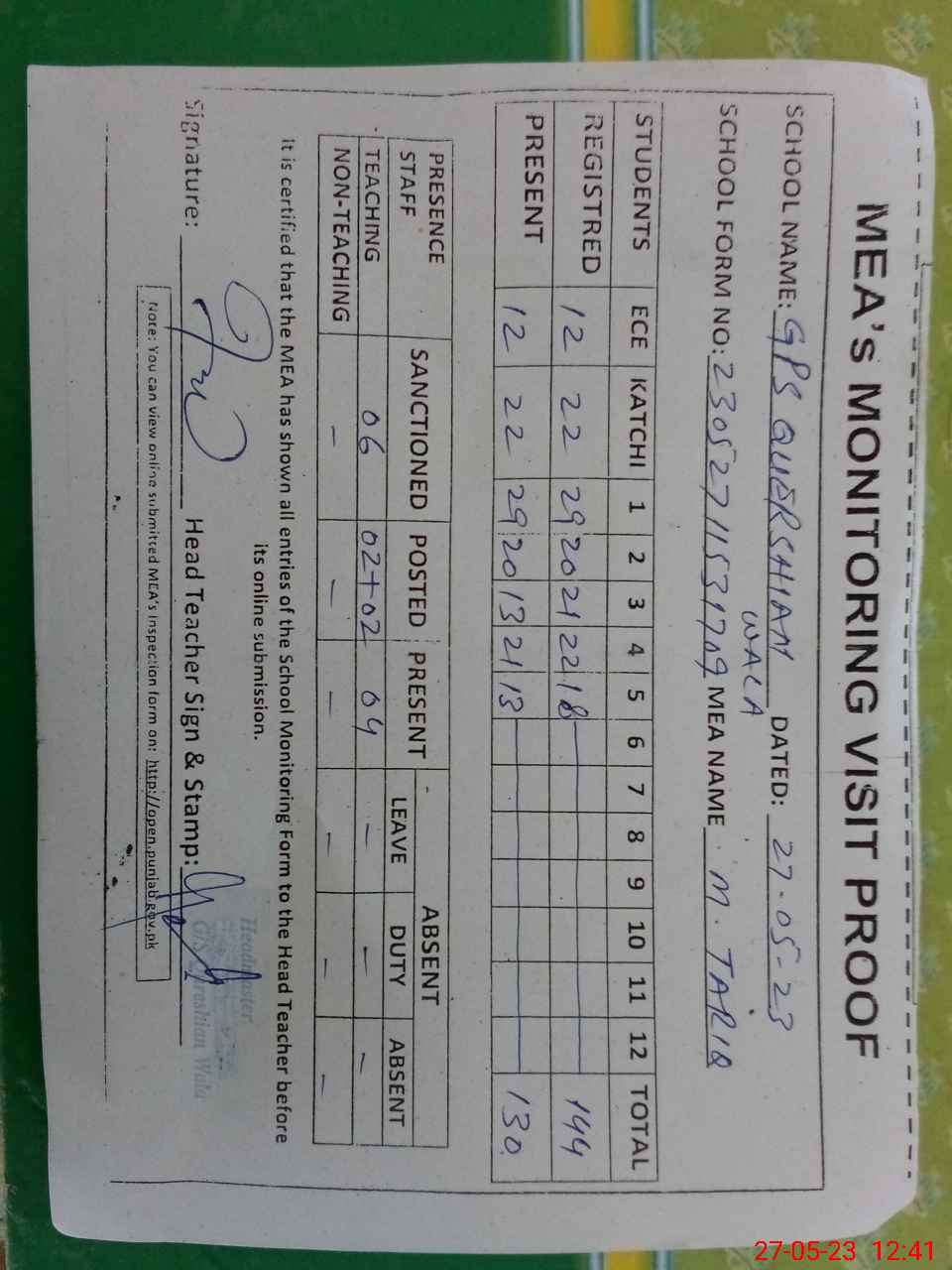 | Attendance Register | Head Teacher | MEA with School | Visit Proof |