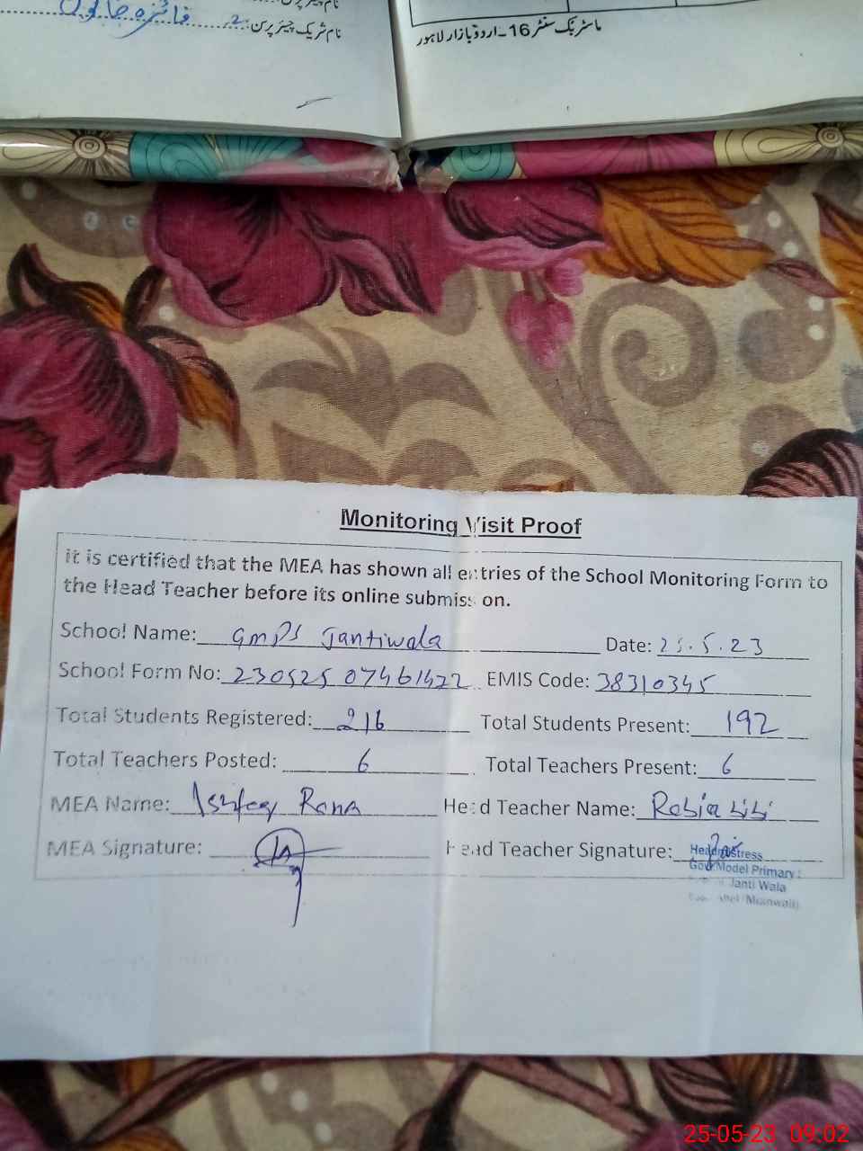 | Attendance Register | Head Teacher | MEA with School | Visit Proof |