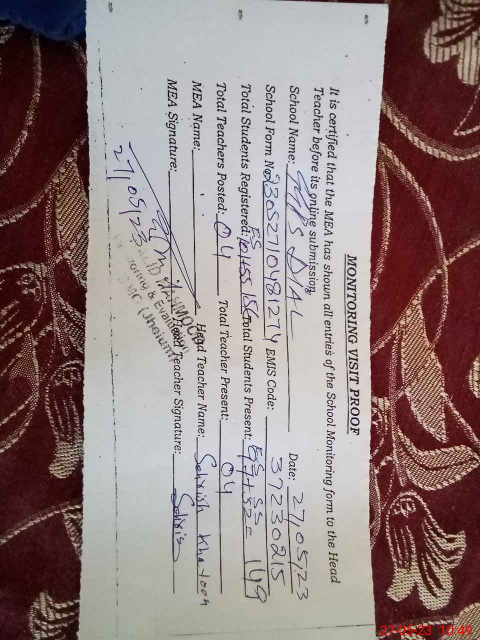 | Attendance Register | Head Teacher | MEA with School | Visit Proof |