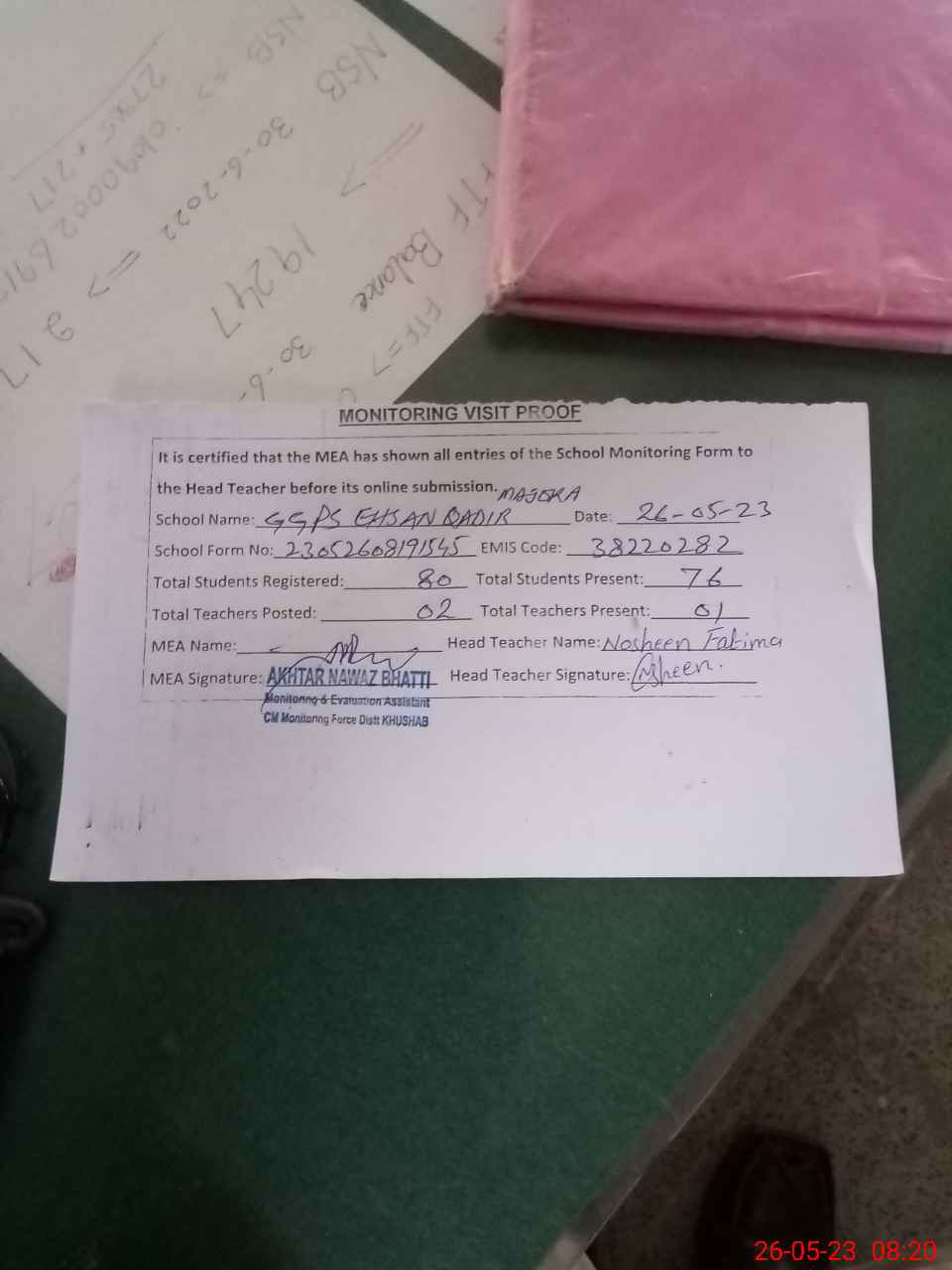 | EMIS Code: 38220282 | Name of School: GGPS EHSAN QADAR MAJOKA | |||