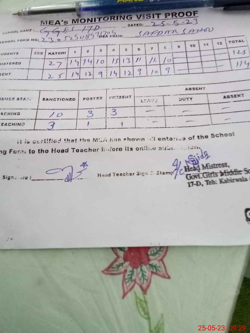 | Attendance Register | Head Teacher | MEA with School | Visit Proof |