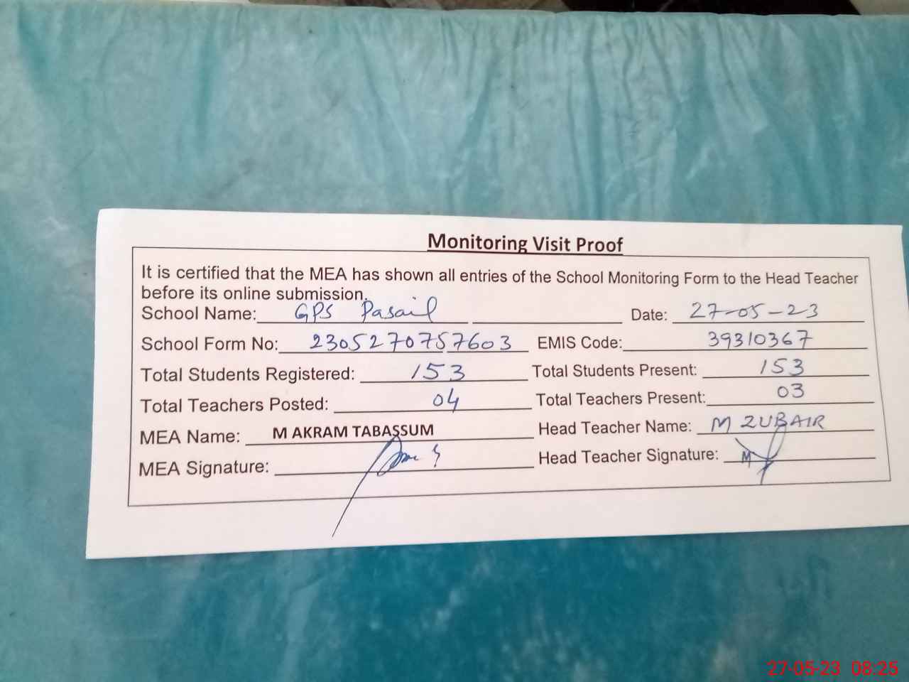 | Attendance Register | Head Teacher | MEA with School | Visit Proof |