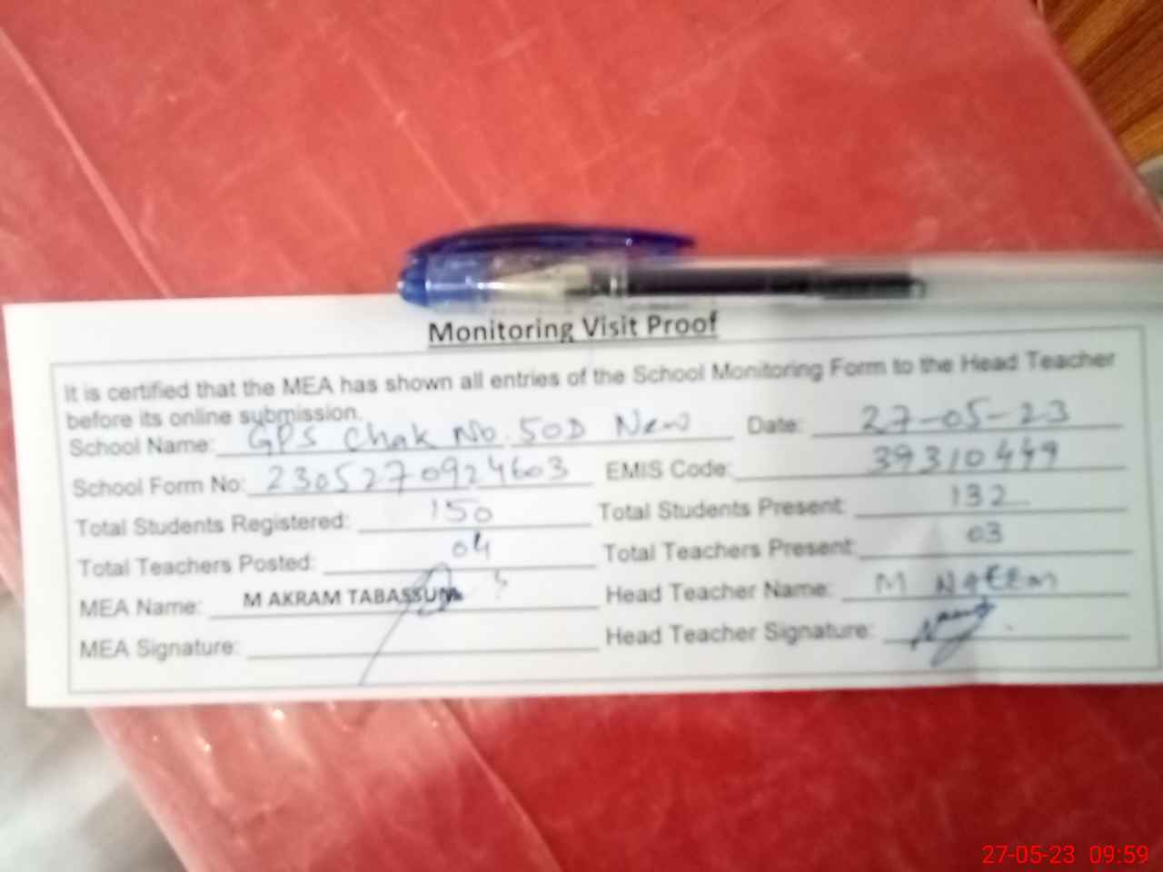 | Attendance Register | Head Teacher | MEA with School | Visit Proof |