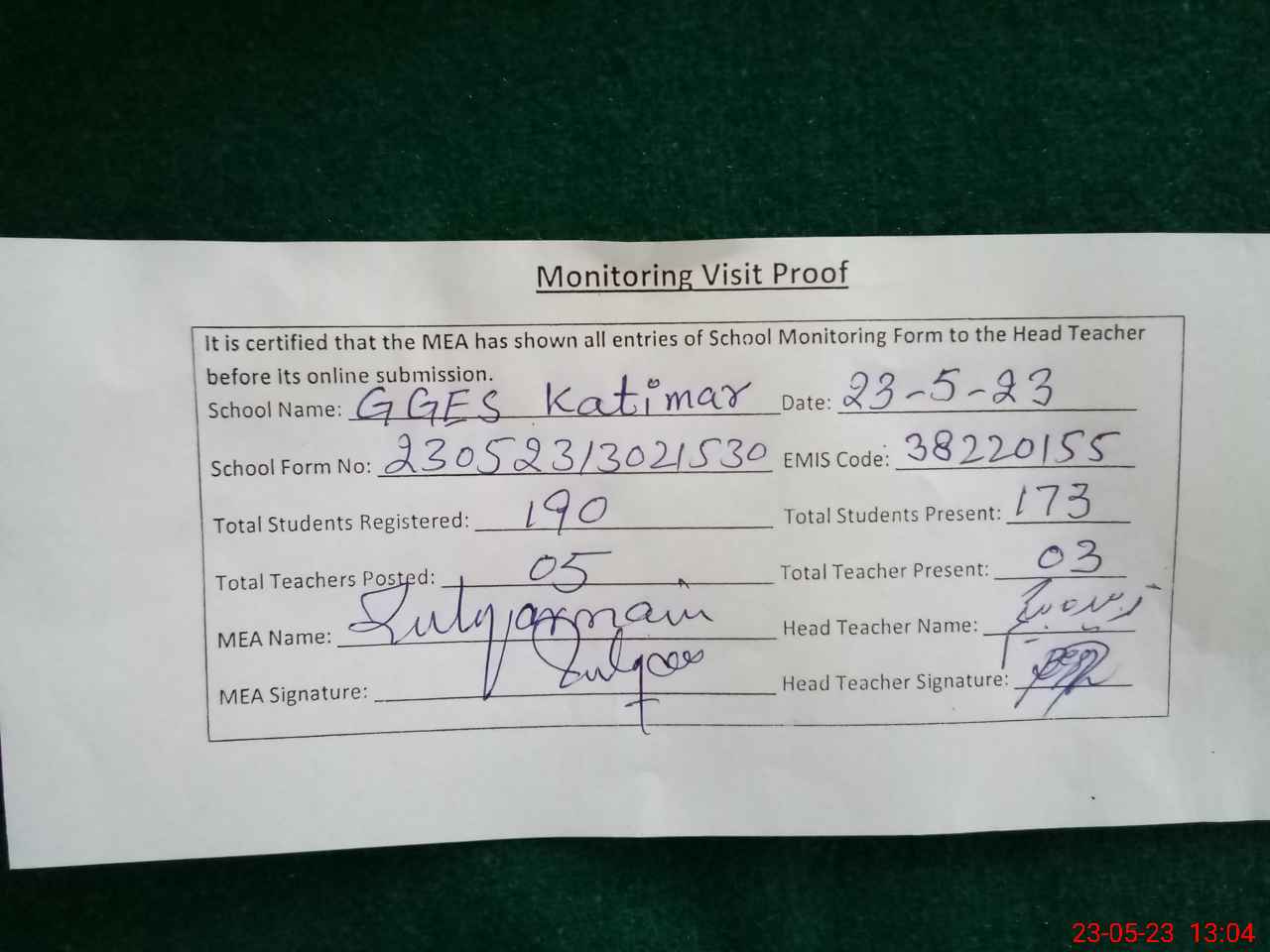 | Attendance Register | Head Teacher | MEA with School | Visit Proof |